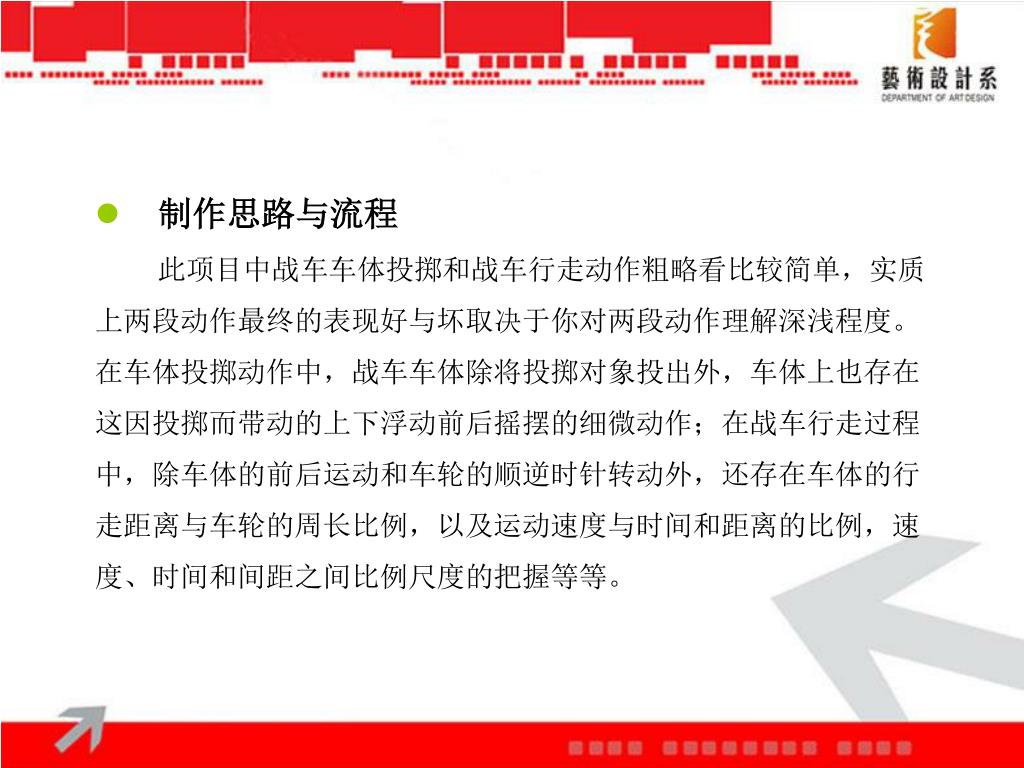 制作思路与流程 • 此项目中战车车体投掷和战车行走动作粗略看比较简单,实质上两段动作最终的表现好与坏取决于你对两段动作理解深浅程度。在车体投掷动作中,战车车体除将投掷对象投出外,车体上也存在这因投掷而带动的上下浮动前后摇摆的细微动作;在战车行走过程中,除车体的前后运动和车轮的顺逆时针转动外,还存在车体的行走距离与车轮的周长比例,以及运动速度与时间和距离的比例,速度、时间和间距之间比例尺度的把握等等。