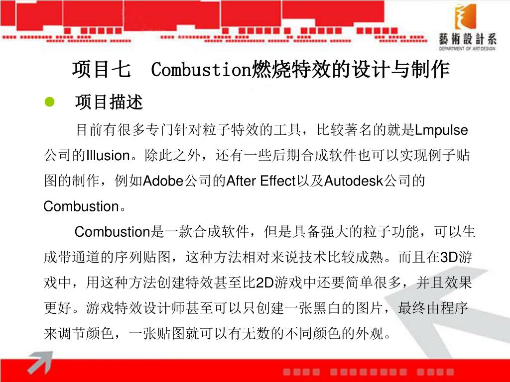 项目七 Combustion燃烧特效的设计与制作 • 项目描述 • 目前有很多专门针对粒子特效的工具,比较著名的就是Lmpulse公司的Illusion。除此之外,还有一些后期合成软件也可以实现例子贴图的制作,例如Adobe公司的After Effect以及Autodesk公司的 Combustion。 • Combustion是一款合成软件,但是具备强大的粒子功能,可以生成带通道的序列贴图,这种方法相对来说技术比较成熟。而且在3D游戏中,用这种方法创建特效甚至比2D游戏中还要简单很多,并且效果更好。游戏特效设计师甚至可以只创建一张黑白的图片,最终由程序来调节颜色,一张贴图就可以有无数的不同颜色的外观。