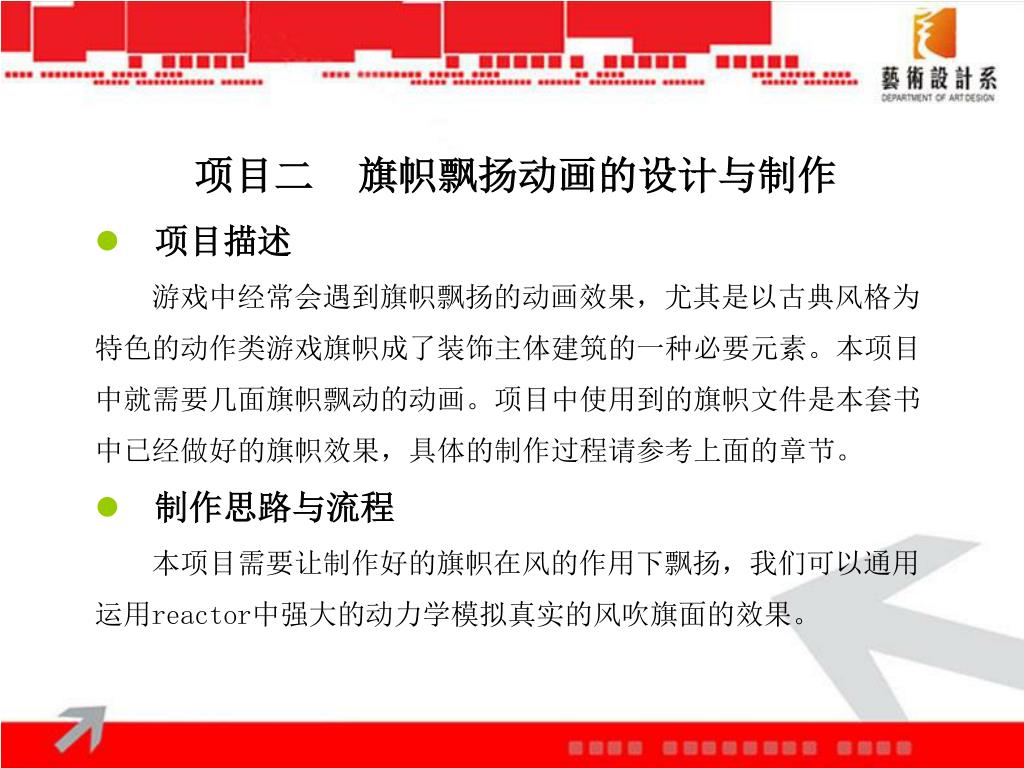项目二 旗帜飘扬动画的设计与制作 • 项目描述 • 游戏中经常会遇到旗帜飘扬的动画效果,尤其是以古典风格为特色的动作类游戏旗帜成了装饰主体建筑的一种必要元素。本项目中就需要几面旗帜飘动的动画。项目中使用到的旗帜文件是本套书中已经做好的旗帜效果,具体的制作过程请参考上面的章节。 • 制作思路与流程 • 本项目需要让制作好的旗帜在风的作用下飘扬,我们可以通用运用reactor中强大的动力学模拟真实的风吹旗面的效果。