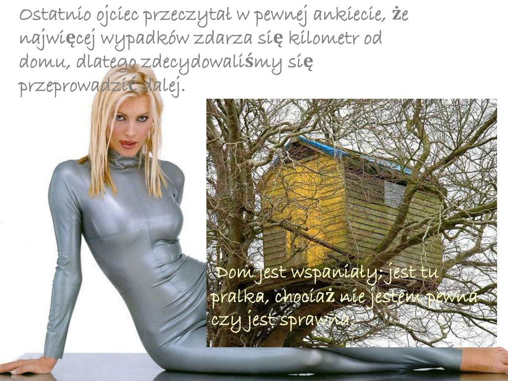 Ostatnio ojciec przeczytał w pewnej ankiecie, że najwięcej wypadków zdarza się kilometr od domu, dlatego zdecydowaliśmy się przeprowadzić dalej. Dom jest wspaniały; jest tu pralka, chociaż nie jestem pewna czy jest sprawna.