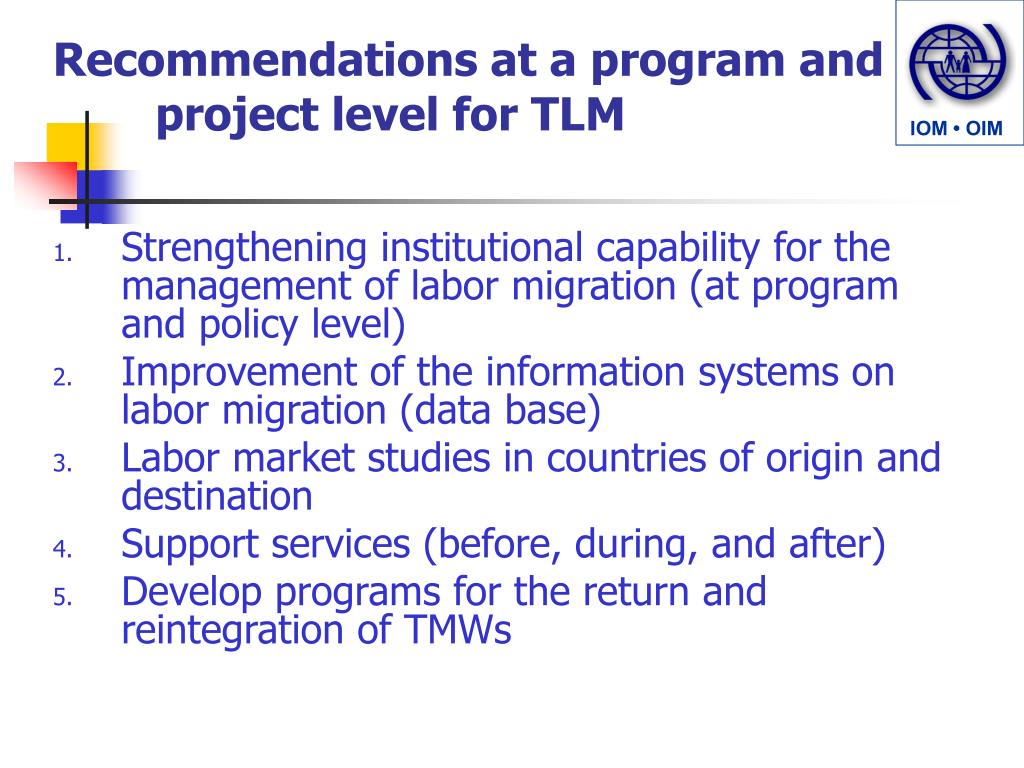 IOM • OIM Recommendations at a program and project level for TLM • Strengthening institutional capability for the management of labor migration (at program and policy level) • Improvement of the information systems on labor migration (data base) • Labor market studies in countries of origin and destination • Support services (before, during, and after) • Develop programs for the return and reintegration of TMWs
