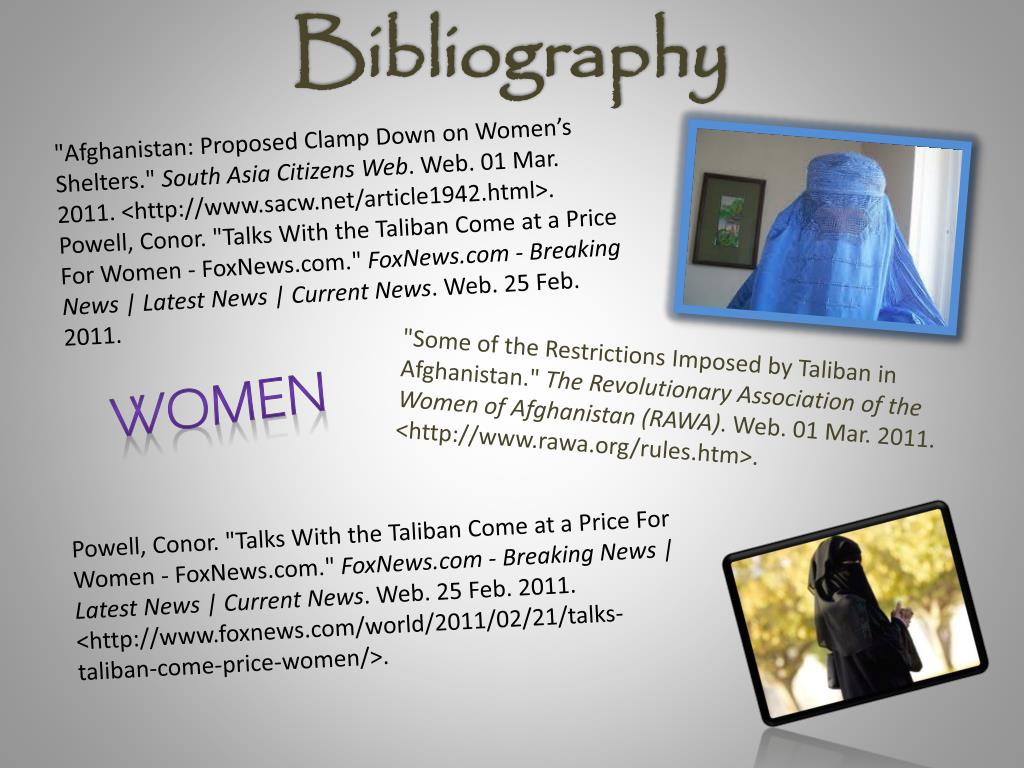 Bibliography "Afghanistan: Proposed Clamp Down on Women’s Shelters." South Asia Citizens Web. Web. 01 Mar. 2011. <http://www.sacw.net/article1942.html>. Powell, Conor. "Talks With the Taliban Come at a Price For Women - FoxNews.com." FoxNews.com - Breaking News | Latest News | Current News. Web. 25 Feb. 2011. "Some of the Restrictions Imposed by Taliban in Afghanistan." The Revolutionary Association of the Women of Afghanistan (RAWA). Web. 01 Mar. 2011. <http://www.rawa.org/rules.htm>. Women Powell, Conor. "Talks With the Taliban Come at a Price For Women - FoxNews.com." FoxNews.com - Breaking News | Latest News | Current News. Web. 25 Feb. 2011. <http://www.foxnews.com/world/2011/02/21/talks-taliban-come-price-women/>.