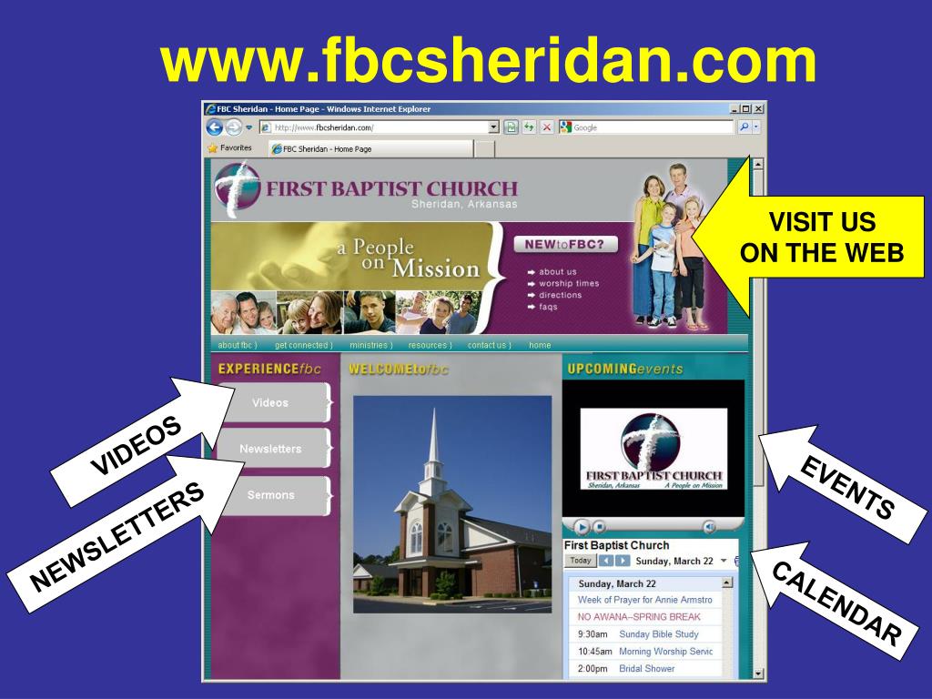 www.fbcsheridan.com VISIT USON THE WEB VIDEOS EVENTS NEWSLETTERS CALENDAR