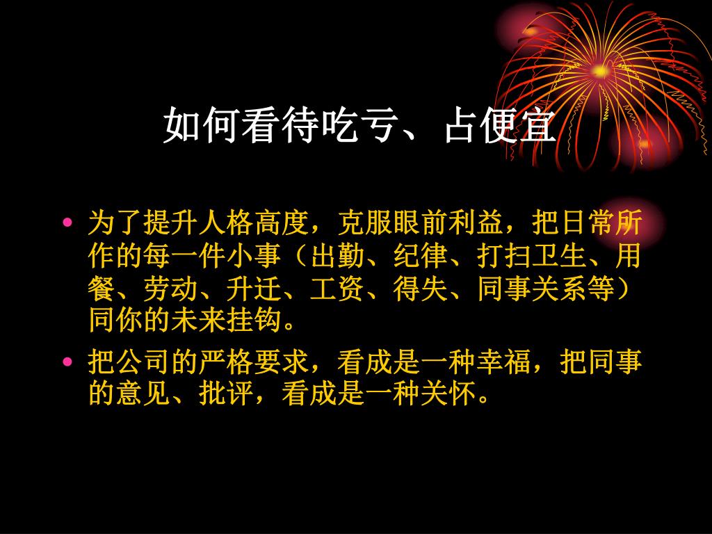 如何看待吃亏、占便宜 • 为了提升人格高度,克服眼前利益,把日常所作的每一件小事(出勤、纪律、打扫卫生、用餐、劳动、升迁、工资、得失、同事关系等)同你的未来挂钩。 • 把公司的严格要求,看成是一种幸福,把同事的意见、批评,看成是一种关怀。