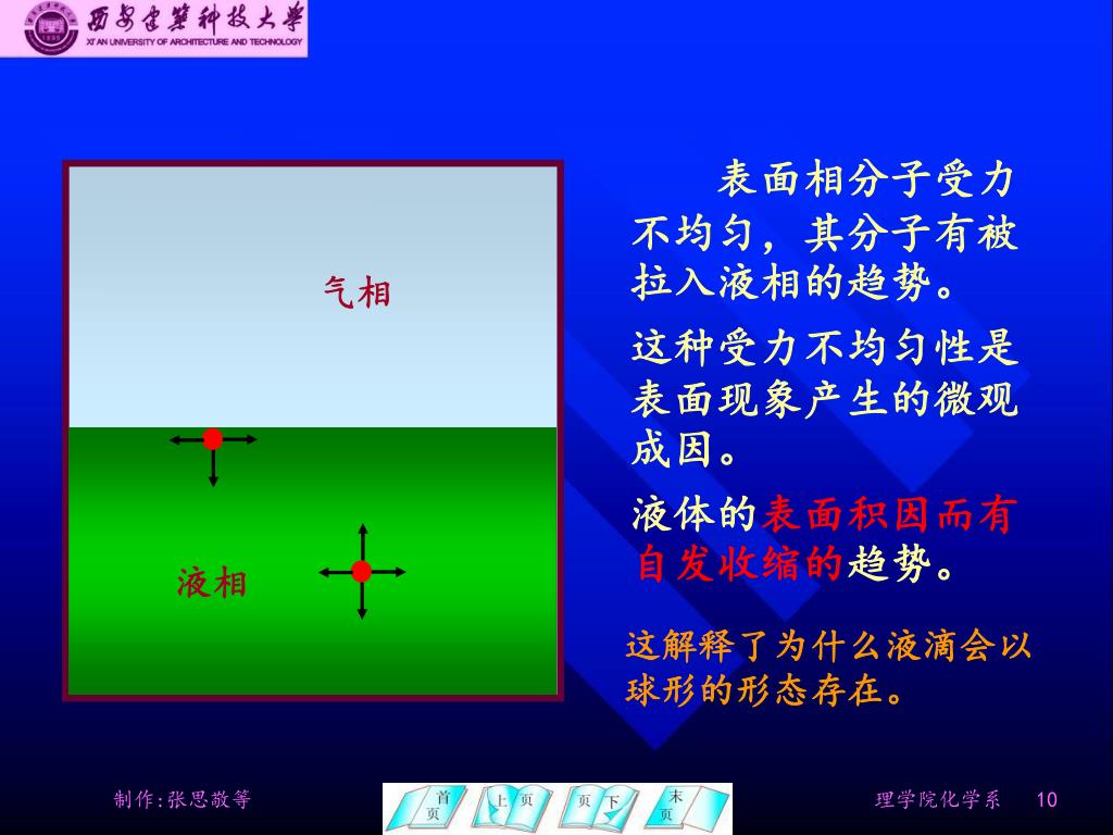 气相 液相 表面相分子受力不均匀,其分子有被拉入液相的趋势。 这种受力不均匀性是表面现象产生的微观成因。 液体的表面积因而有自发收缩的趋势。 这解释了为什么液滴会以 球形的形态存在。