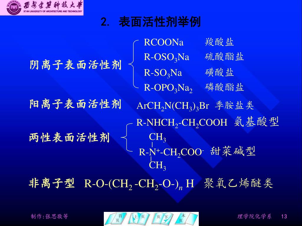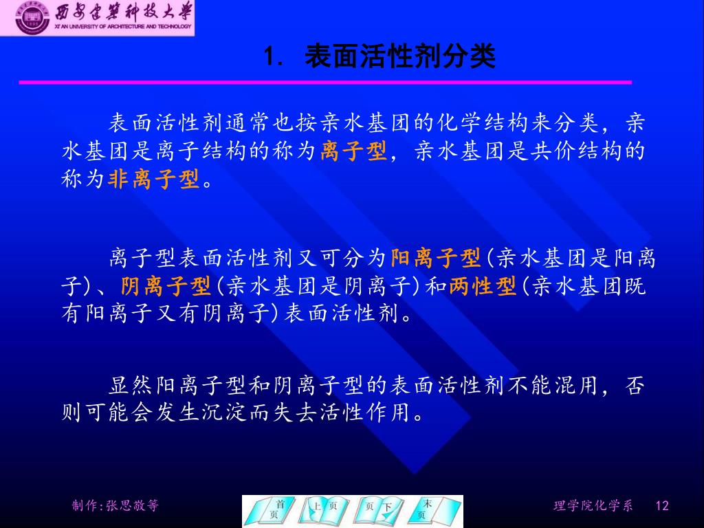 1. 表面活性剂分类 表面活性剂通常也按亲水基团的化学结构来分类,亲水基团是离子结构的称为离子型,亲水基团是共价结构的称为非离子型。 离子型表面活性剂又可分为阳离子型(亲水基团是阳离子)、阴离子型(亲水基团是阴离子)和两性型(亲水基团既有阳离子又有阴离子)表面活性剂。 显然阳离子型和阴离子型的表面活性剂不能混用,否则可能会发生沉淀而失去活性作用。
