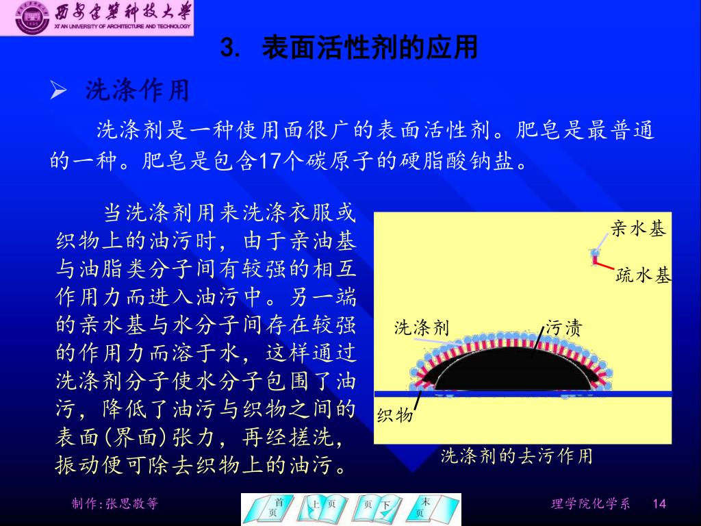 亲水基 疏水基 洗涤剂 污渍 污渍 织物 3. 表面活性剂的应用 • 洗涤作用 • 洗涤剂是一种使用面很广的表面活性剂。肥皂是最普通的一种。肥皂是包含17个碳原子的硬脂酸钠盐。 当洗涤剂用来洗涤衣服或织物上的油污时,由于亲油基与油脂类分子间有较强的相互作用力而进入油污中。另一端的亲水基与水分子间存在较强的作用力而溶于水,这样通过洗涤剂分子使水分子包围了油污,降低了油污与织物之间的表面(界面)张力,再经搓洗,振动便可除去织物上的油污。 洗涤剂的去污作用