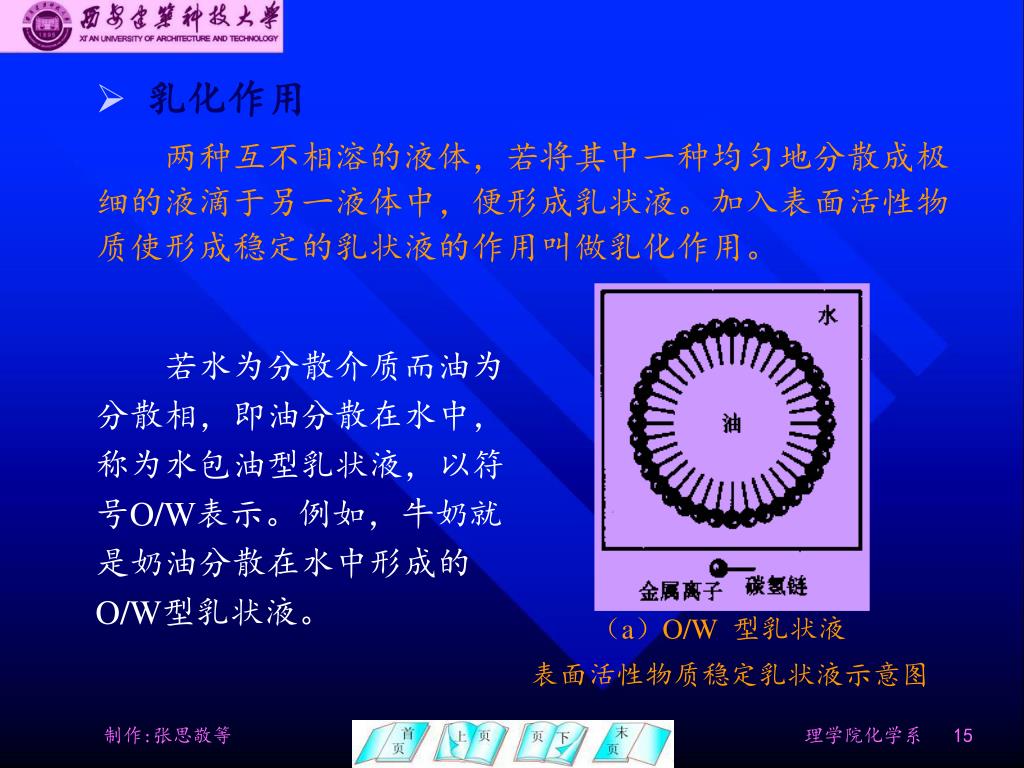 乳化作用 • 两种互不相溶的液体,若将其中一种均匀地分散成极细的液滴于另一液体中,便形成乳状液。加入表面活性物质使形成稳定的乳状液的作用叫做乳化作用。 若水为分散介质而油为分散相,即油分散在水中,称为水包油型乳状液,以符号O/W表示。例如,牛奶就是奶油分散在水中形成的O/W型乳状液。 (a)O/W型乳状液 表面活性物质稳定乳状液示意图