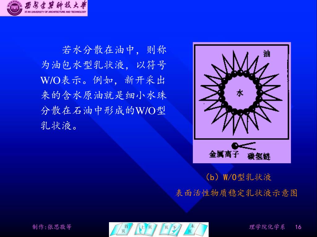 若水分散在油中,则称为油包水型乳状液,以符号W/O表示。例如,新开采出来的含水原油就是细小水珠分散在石油中形成的W/O型乳状液。若水分散在油中,则称为油包水型乳状液,以符号W/O表示。例如,新开采出来的含水原油就是细小水珠分散在石油中形成的W/O型乳状液。 (b)W/O型乳状液 表面活性物质稳定乳状液示意图
