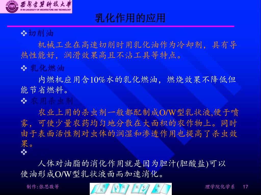 乳化作用的应用 • 切削油 机械工业在高速切削时用乳化油作为冷却剂,具有导热性能好,润滑效果高且不沾工具等特点。 • 乳化燃油 • 内燃机应用含10%水的乳化燃油,燃烧效果不降低但能节省燃料。 • 农用杀虫剂 • 农业上用的杀虫剂一般都配制成O/W型乳状液,便于喷雾,可使少量农药均匀地分散在大面积的农作物上。同时由于表面活性剂对虫体的润湿和渗透作用也提高了杀虫效果。 • 其它 • 人体对油脂的消化作用就是因为胆汁(胆酸盐)可以使油形成O/W型乳状液面而加速消化。