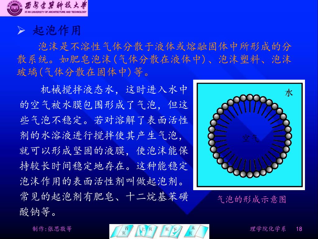 起泡作用 • 泡沫是不溶性气体分散于液体或熔融固体中所形成的分散系统。如肥皂泡沫(气体分散在液体中)、泡沫塑料、泡沫玻璃(气体分散在固体中)等。 机械搅拌液态水,这时进入水中的空气被水膜包围形成了气泡,但这些气泡不稳定。若对溶解了表面活性剂的水溶液进行搅拌使其产生气泡,就可以形成坚固的液膜,使泡沫能保持较长时间稳定地存在。这种能稳定泡沫作用的表面活性剂叫做起泡剂。常见的起泡剂有肥皂、十二烷基苯磺酸钠等。 空气 气泡的形成示意图