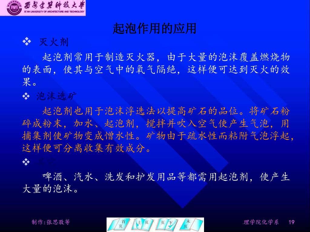 起泡作用的应用 • 灭火剂 • 起泡剂常用于制造灭火器,由于大量的泡沫覆盖燃烧物的表面,使其与空气中的氧气隔绝,这样便可达到灭火的效果。 • 泡沫选矿 • 起泡剂也用于泡沫浮选法以提高矿石的品位。将矿石粉碎成粉末,加水、起泡剂,搅拌并吹入空气使产生气泡,用捕集剂使矿物变成憎水性。矿物由于疏水性而粘附气泡浮起,这样便可分离收集有效成分。 • 其它 • 啤酒、汽水、洗发和护发用品等都需用起泡剂,使产生大量的泡沫。