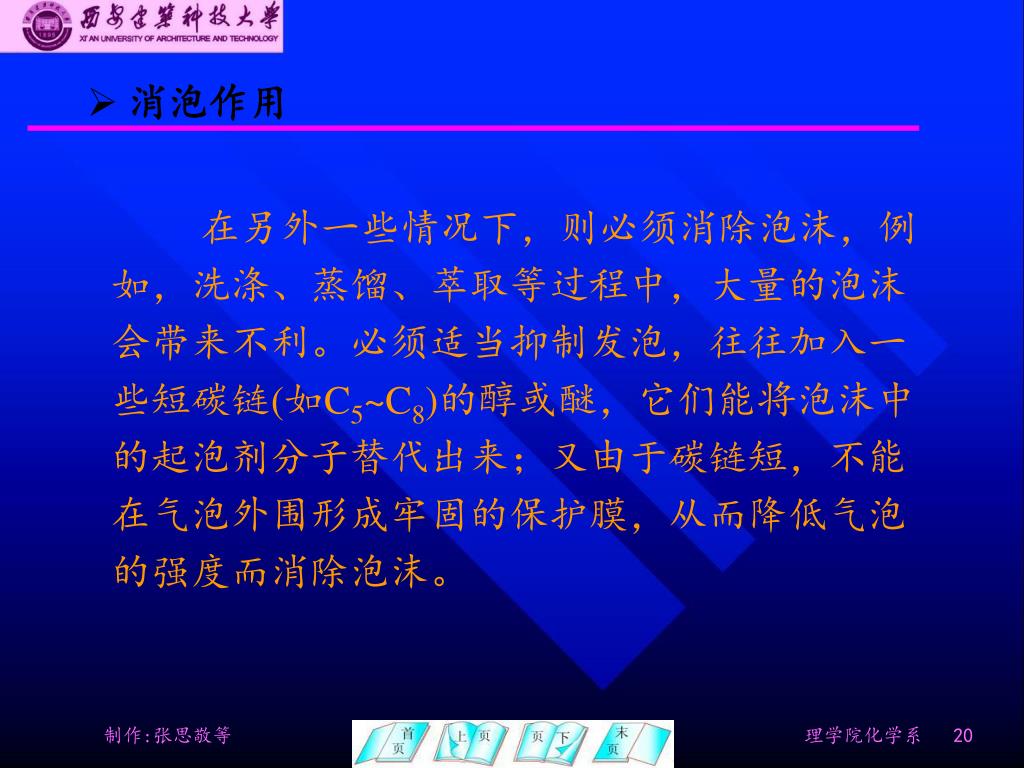 消泡作用 在另外一些情况下,则必须消除泡沫,例如,洗涤、蒸馏、萃取等过程中,大量的泡沫会带来不利。必须适当抑制发泡,往往加入一些短碳链(如C5~C8)的醇或醚,它们能将泡沫中的起泡剂分子替代出来;又由于碳链短,不能在气泡外围形成牢固的保护膜,从而降低气泡的强度而消除泡沫。