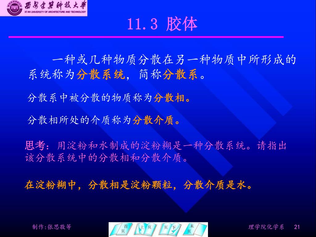 11.3 胶体 一种或几种物质分散在另一种物质中所形成的系统称为分散系统,简称分散系。 分散系中被分散的物质称为分散相。 分散相所处的介质称为分散介质。 思考:用淀粉和水制成的淀粉糊是一种分散系统。请指出该分散系统中的分散相和分散介质。 在淀粉糊中,分散相是淀粉颗粒,分散介质是水。
