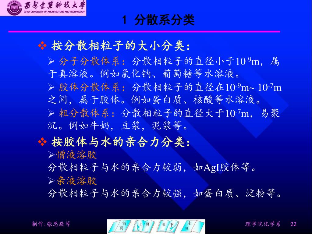 1 分散系分类 • 按分散相粒子的大小分类: • 分子分散体系:分散相粒子的直径小于10-9m,属于真溶液。例如氯化钠、葡萄糖等水溶液。 • 胶体分散体系:分散相粒子的直径在10-9m~ 10-7m之间,属于胶体。例如蛋白质、核酸等水溶液。 • 粗分散体系:分散相粒子的直径大于10-7m,易聚沉。例如牛奶,豆浆,泥浆等。 • 按胶体与水的亲合力分类: • 憎液溶胶 分散相粒子与水的亲合力较弱,如AgI胶体等。 • 亲液溶胶 分散相粒子与水的亲合力较强,如蛋白质、淀粉等。