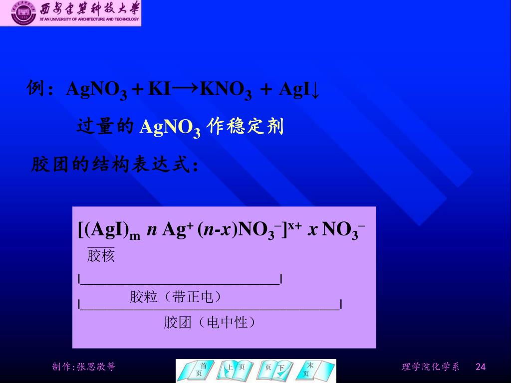 [(AgI)m n Ag+ (n-x)NO3–]x+ xNO3– |______________________________| |_______________________________________| 例:AgNO3 +KI→KNO3 + AgI↓ 过量的 AgNO3作稳定剂 胶团的结构表达式: