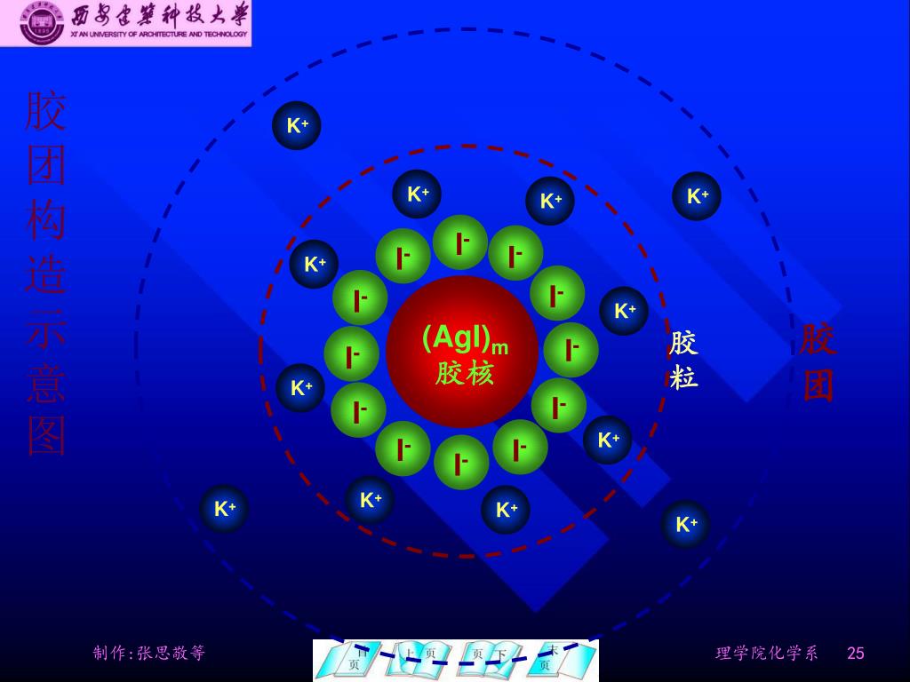 K+ K+ K+ K+ K+ K+ I- I- I- K+ I- I- K+ 胶团 (AgI)m 胶核 胶粒 I- I- K+ I- I- K+ I- I- I- K+ K+ 胶团构造示意图