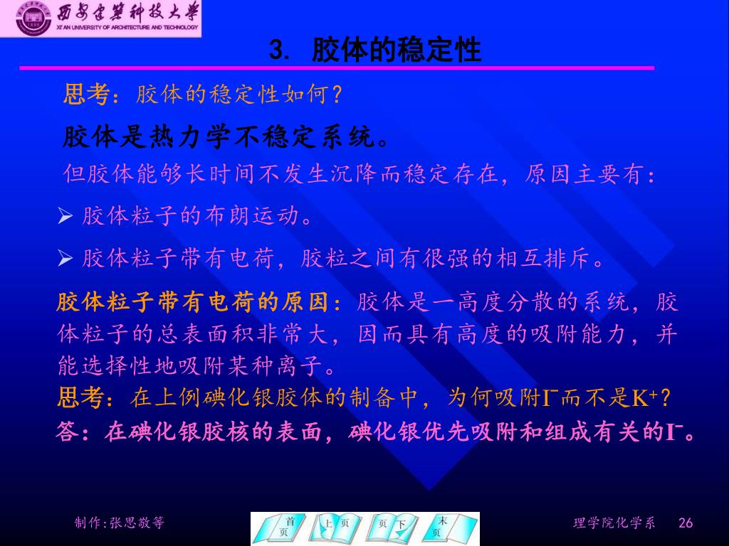 3. 胶体的稳定性 思考:胶体的稳定性如何? 胶体是热力学不稳定系统。 但胶体能够长时间不发生沉降而稳定存在,原因主要有: • 胶体粒子的布朗运动。 • 胶体粒子带有电荷,胶粒之间有很强的相互排斥。 胶体粒子带有电荷的原因:胶体是一高度分散的系统,胶体粒子的总表面积非常大,因而具有高度的吸附能力,并能选择性地吸附某种离子。 思考:在上例碘化银胶体的制备中,为何吸附Iˉ而不是K+? 答:在碘化银胶核的表面,碘化银优先吸附和组成有关的Iˉ。