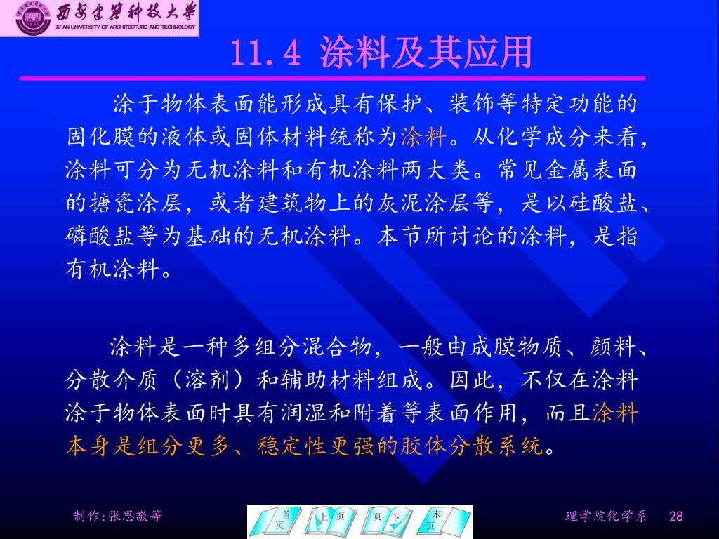 11.4 涂料及其应用 涂于物体表面能形成具有保护、装饰等特定功能的固化膜的液体或固体材料统称为涂料。从化学成分来看,涂料可分为无机涂料和有机涂料两大类。常见金属表面的搪瓷涂层,或者建筑物上的灰泥涂层等,是以硅酸盐、磷酸盐等为基础的无机涂料。本节所讨论的涂料,是指有机涂料。 涂料是一种多组分混合物,一般由成膜物质、颜料、分散介质(溶剂)和辅助材料组成。因此,不仅在涂料涂于物体表面时具有润湿和附着等表面作用,而且涂料本身是组分更多、稳定性更强的胶体分散系统。