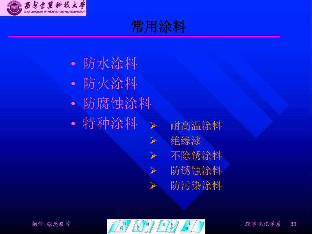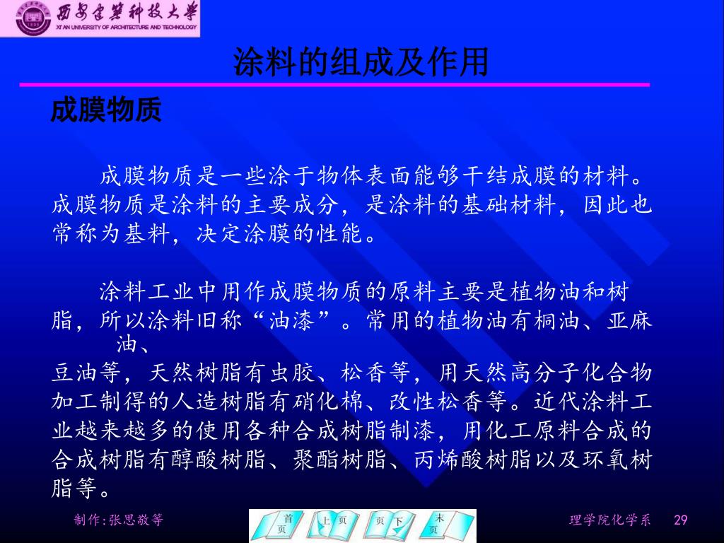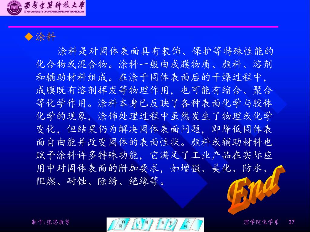 涂料 涂料是对固体表面具有装饰、保护等特殊性能的化合物或混合物。涂料一般由成膜物质、颜料、溶剂和辅助材料组成。在涂于固体表面后的干燥过程中,成膜既有溶剂挥发等物理作用,也可能有缩合、聚合等化学作用。涂料本身已反映了各种表面化学与胶体化学的现象,涂饰处理过程中虽然发生了物理或化学变化,但结果仍为解决固体表面问题,即降低固体表面自由能并改变固体的表面性状。颜料或辅助材料也赋予涂料许多特殊功能,它满足了工业产品在实际应用中对固体表面的附加要求,如增强、美化、防水、阻燃、耐蚀、除绣、绝缘等。 End