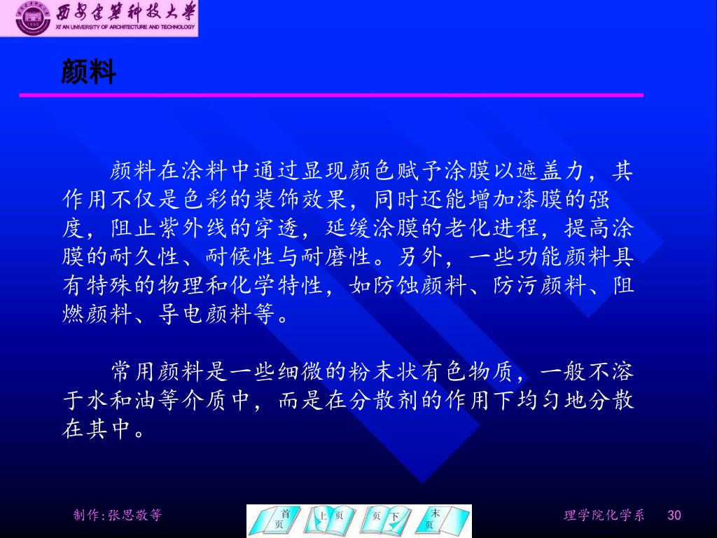 颜料 颜料在涂料中通过显现颜色赋予涂膜以遮盖力,其 作用不仅是色彩的装饰效果,同时还能增加漆膜的强 度,阻止紫外线的穿透,延缓涂膜的老化进程,提高涂 膜的耐久性、耐候性与耐磨性。另外,一些功能颜料具 有特殊的物理和化学特性,如防蚀颜料、防污颜料、阻 燃颜料、导电颜料等。 常用颜料是一些细微的粉末状有色物质,一般不溶 于水和油等介质中,而是在分散剂的作用下均匀地分散 在其中。