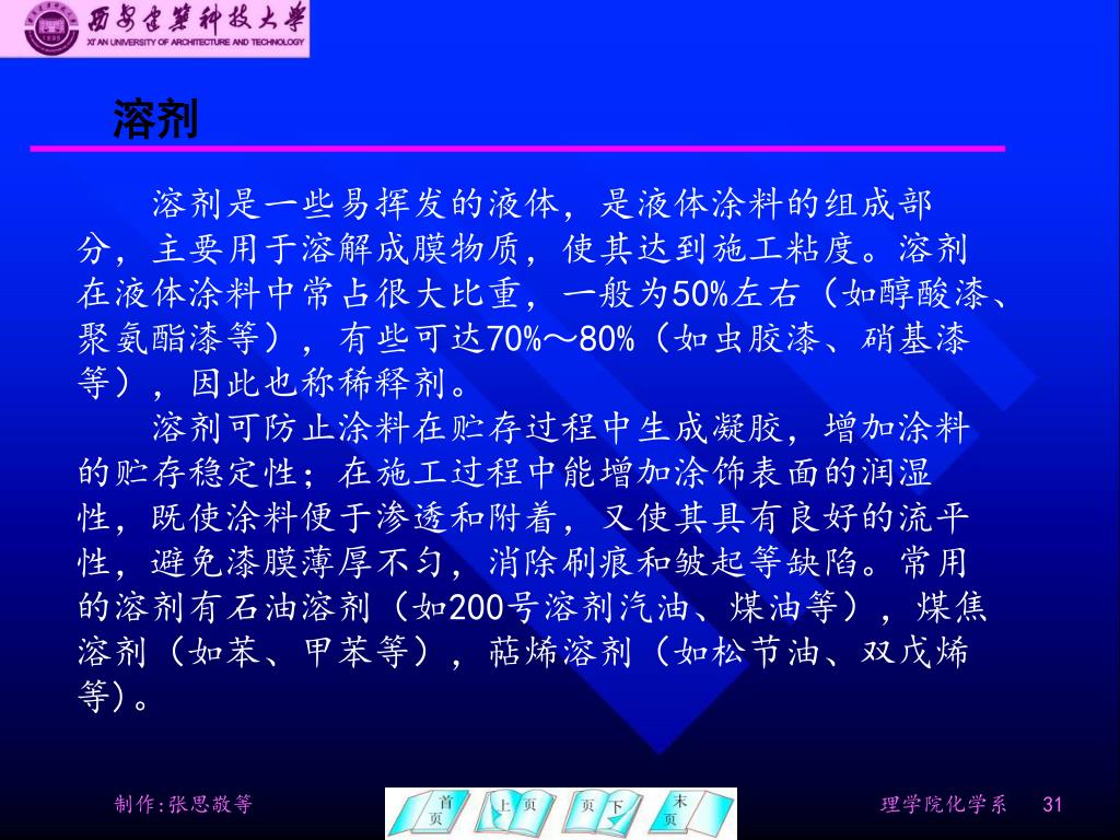 溶剂 溶剂是一些易挥发的液体,是液体涂料的组成部 分,主要用于溶解成膜物质,使其达到施工粘度。溶剂 在液体涂料中常占很大比重,一般为50%左右(如醇酸漆、 聚氨酯漆等),有些可达70%~80%(如虫胶漆、硝基漆 等),因此也称稀释剂。 溶剂可防止涂料在贮存过程中生成凝胶,增加涂料 的贮存稳定性;在施工过程中能增加涂饰表面的润湿 性,既使涂料便于渗透和附着,又使其具有良好的流平 性,避免漆膜薄厚不匀,消除刷痕和皱起等缺陷。常用 的溶剂有石油溶剂(如200号溶剂汽油、煤油等),煤焦 溶剂(如苯、甲苯等),萜烯溶剂(如松节油、双戊烯 等)。