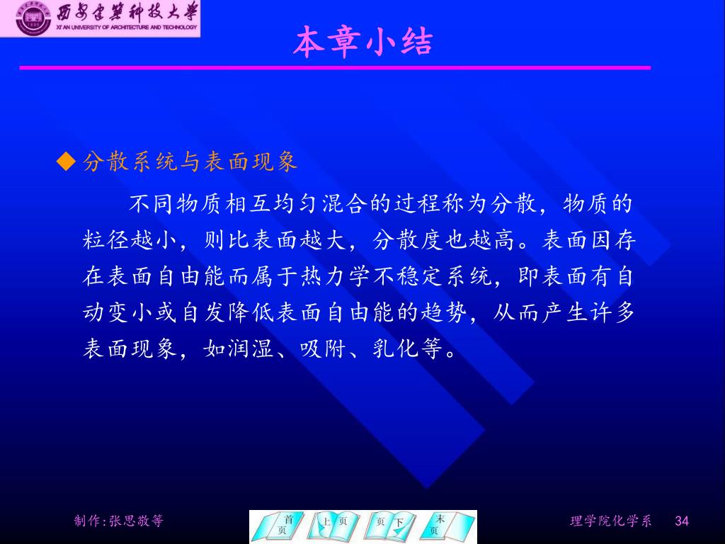本章小结 • 分散系统与表面现象 不同物质相互均匀混合的过程称为分散,物质的粒径越小,则比表面越大,分散度也越高。表面因存在表面自由能而属于热力学不稳定系统,即表面有自动变小或自发降低表面自由能的趋势,从而产生许多表面现象,如润湿、吸附、乳化等。