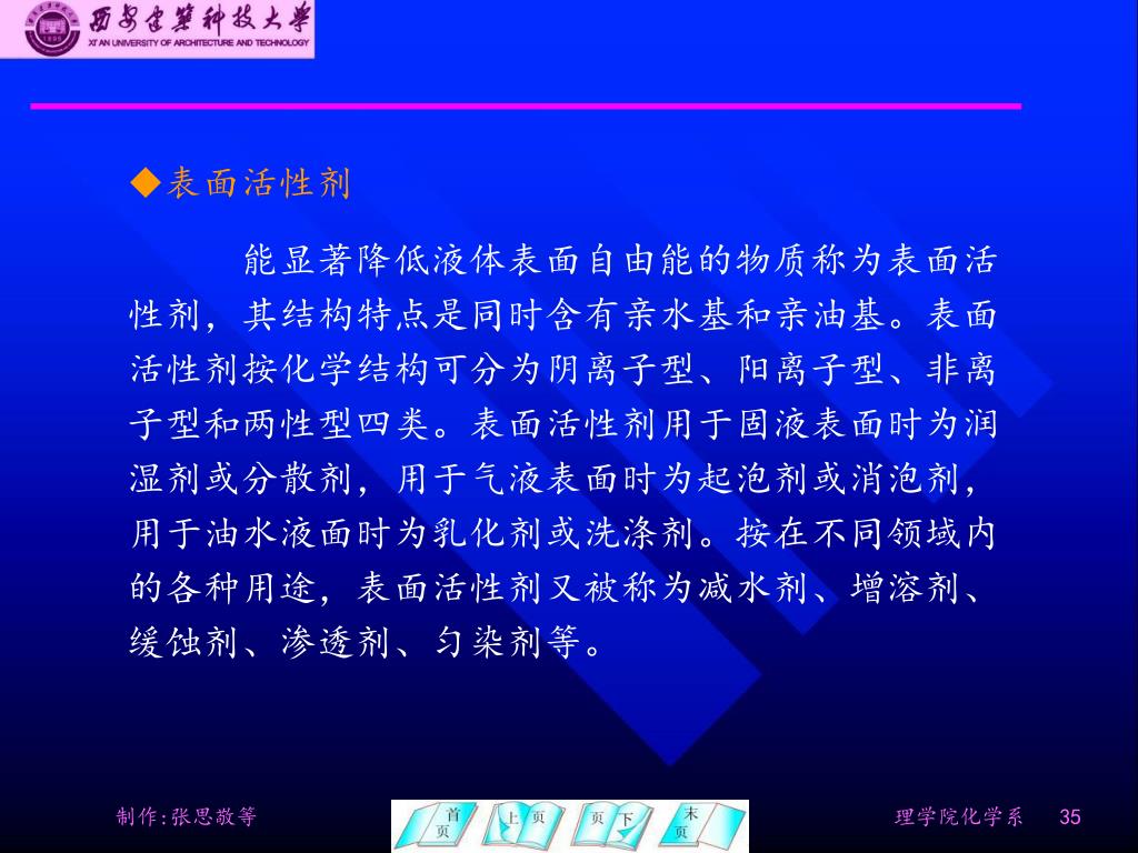 表面活性剂 • 能显著降低液体表面自由能的物质称为表面活性剂,其结构特点是同时含有亲水基和亲油基。表面活性剂按化学结构可分为阴离子型、阳离子型、非离子型和两性型四类。表面活性剂用于固液表面时为润湿剂或分散剂,用于气液表面时为起泡剂或消泡剂,用于油水液面时为乳化剂或洗涤剂。按在不同领域内的各种用途,表面活性剂又被称为减水剂、增溶剂、缓蚀剂、渗透剂、匀染剂等。