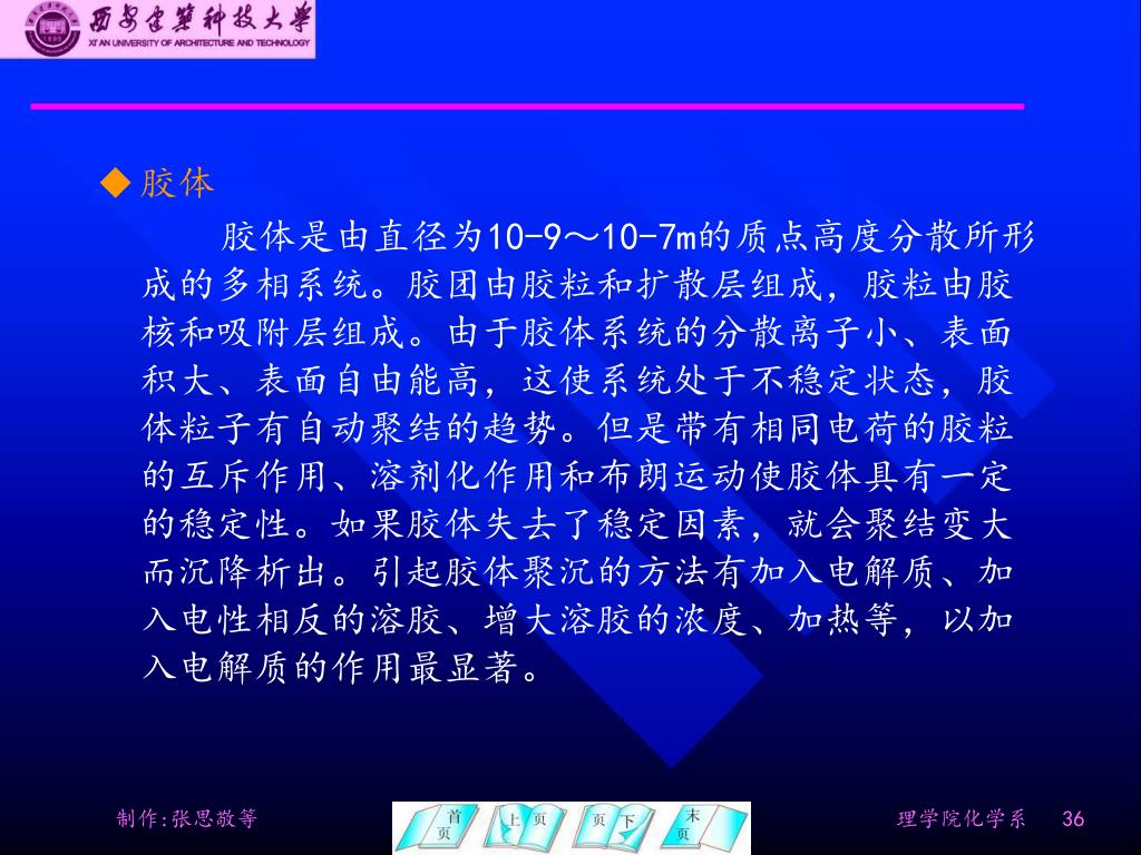 胶体 胶体是由直径为10-9~10-7m的质点高度分散所形成的多相系统。胶团由胶粒和扩散层组成,胶粒由胶核和吸附层组成。由于胶体系统的分散离子小、表面积大、表面自由能高,这使系统处于不稳定状态,胶体粒子有自动聚结的趋势。但是带有相同电荷的胶粒的互斥作用、溶剂化作用和布朗运动使胶体具有一定的稳定性。如果胶体失去了稳定因素,就会聚结变大而沉降析出。引起胶体聚沉的方法有加入电解质、加入电性相反的溶胶、增大溶胶的浓度、加热等,以加入电解质的作用最显著。