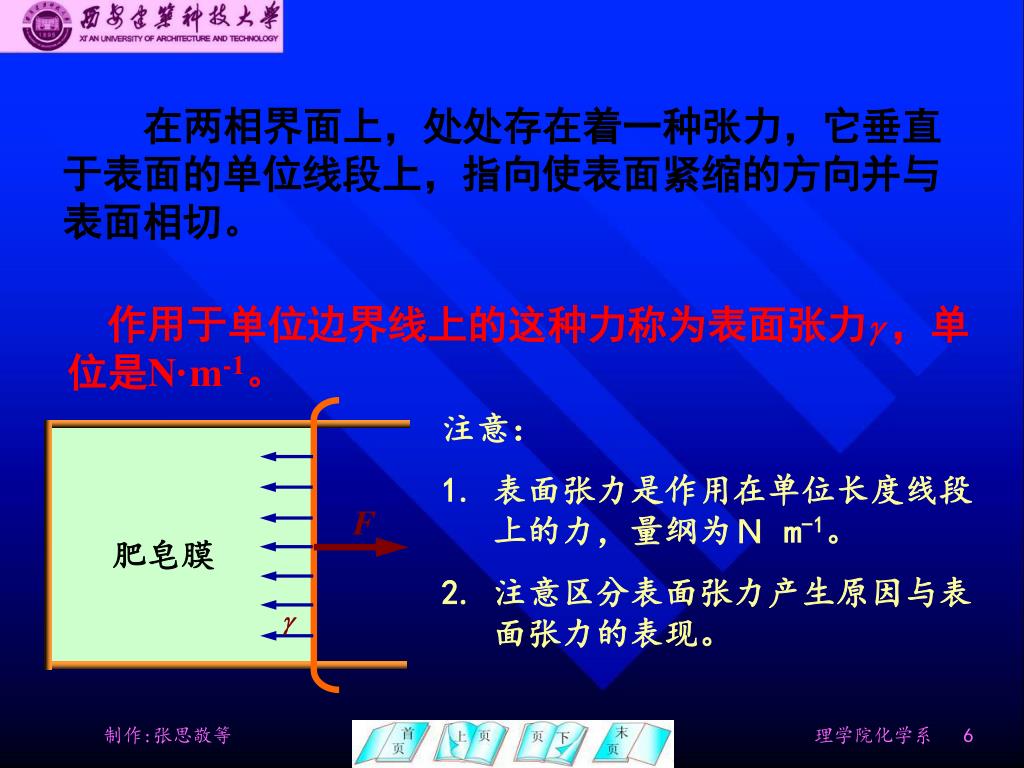 F 肥皂膜 在两相界面上,处处存在着一种张力,它垂直于表面的单位线段上,指向使表面紧缩的方向并与表面相切。 作用于单位边界线上的这种力称为表面张力,单位是N·m-1。 • 注意: • 表面张力是作用在单位长度线段上的力,量纲为N m-1。 • 注意区分表面张力产生原因与表面张力的表现。