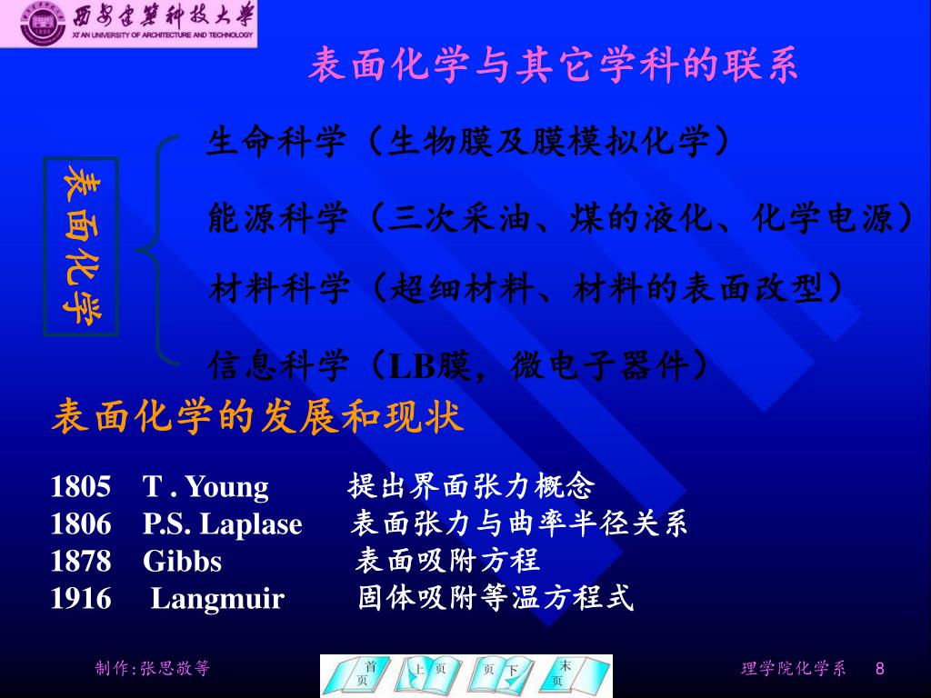 表面化学与其它学科的联系 生命科学(生物膜及膜模拟化学) 表面化学 能源科学(三次采油、煤的液化、化学电源) 材料科学(超细材料、材料的表面改型) 信息科学(LB膜,微电子器件) 表面化学的发展和现状 1805 T . Young 提出界面张力概念 1806 P.S. Laplase 表面张力与曲率半径关系 1878 Gibbs 表面吸附方程 1916 Langmuir 固体吸附等温方程式