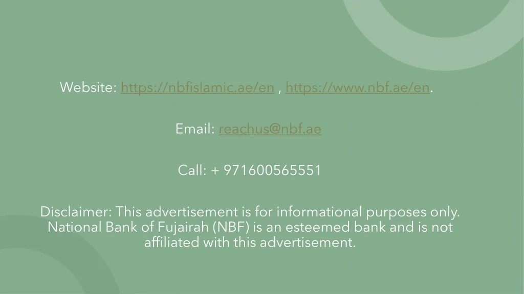 Website: https://nbfislamic.ae/en , https://www.nbf.ae/en. Email: reachus@nbf.ae Call: + 971600565551 Disclaimer: This advertisement is for informational purposes only. National Bank of Fujairah (NBF) is an esteemed bank and is not affiliated with this advertisement.