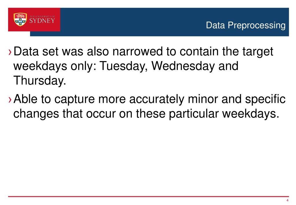Data Preprocessing • Data set was also narrowed to contain the target weekdays only: Tuesday, Wednesday and Thursday. • Able to capture more accurately minor and specific changes that occur on these particular weekdays.