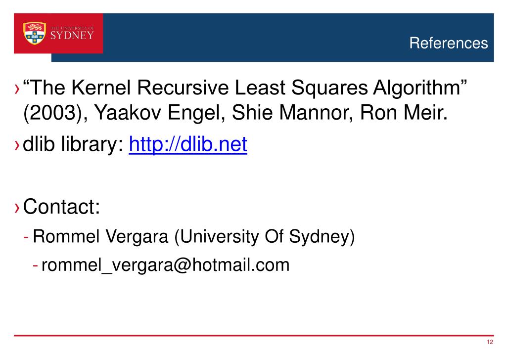 References • “The Kernel Recursive Least Squares Algorithm” (2003), Yaakov Engel, ShieMannor, Ron Meir. • dlib library: http://dlib.net • Contact: • Rommel Vergara (University Of Sydney) • rommel_vergara@hotmail.com