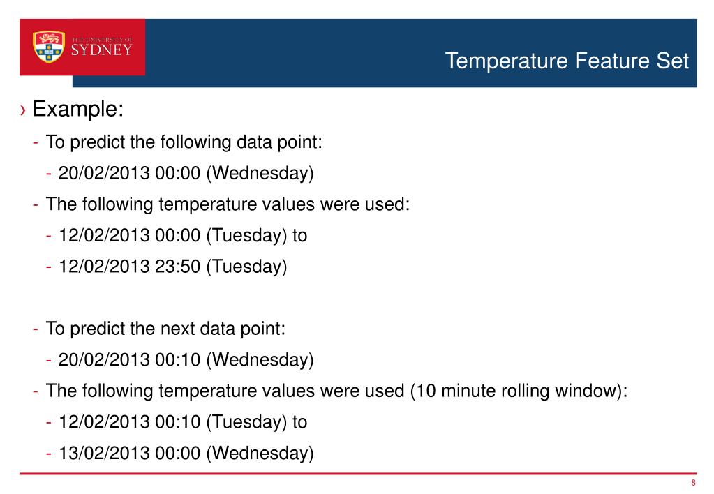 Temperature Feature Set • Example: • To predict the following data point: • 20/02/2013 00:00 (Wednesday) • The following temperature values were used: • 12/02/2013 00:00 (Tuesday) to • 12/02/2013 23:50 (Tuesday) • To predict the next data point: • 20/02/2013 00:10 (Wednesday) • The following temperature values were used (10 minute rolling window): • 12/02/2013 00:10 (Tuesday) to • 13/02/2013 00:00 (Wednesday)