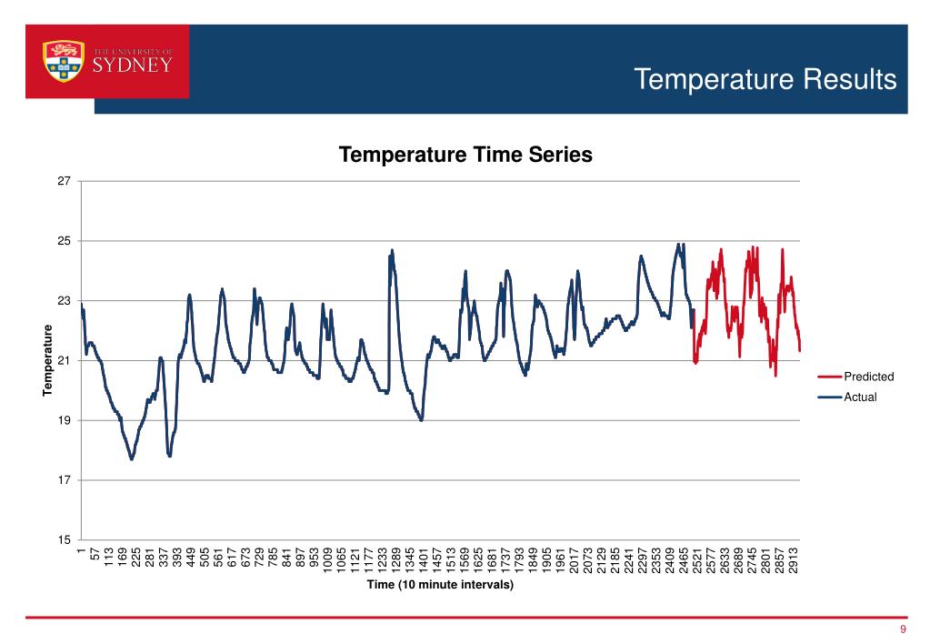 Data Preprocessing • All data sets contained missing data and were aperiodic in nature. • SOLUTION: • Missing Data: Missing data occurrences were linearly approximated between their adjacent available data points. • Aperiodic Nature: Data was standardized into 10 minutes intervals (as required by the format for the competition)