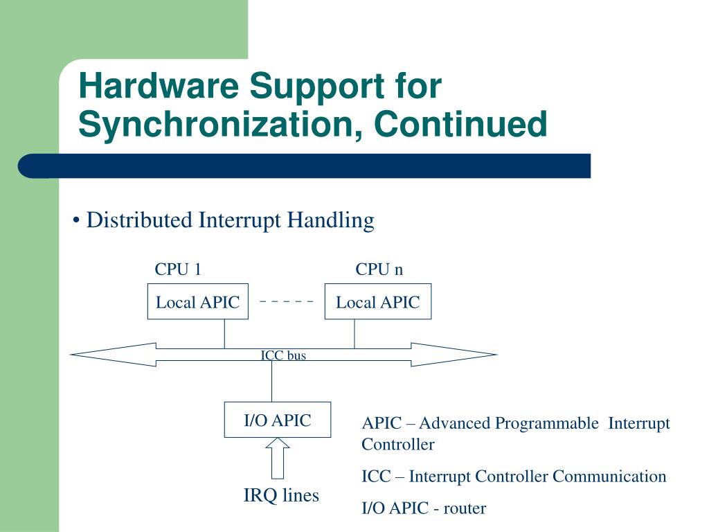 Hardware Support for Synchronization, Continued • Distributed Interrupt Handling CPU 1 CPU n Local APIC Local APIC ICC bus I/O APIC APIC – Advanced Programmable Interrupt Controller ICC – Interrupt Controller Communication I/O APIC - router IRQ lines