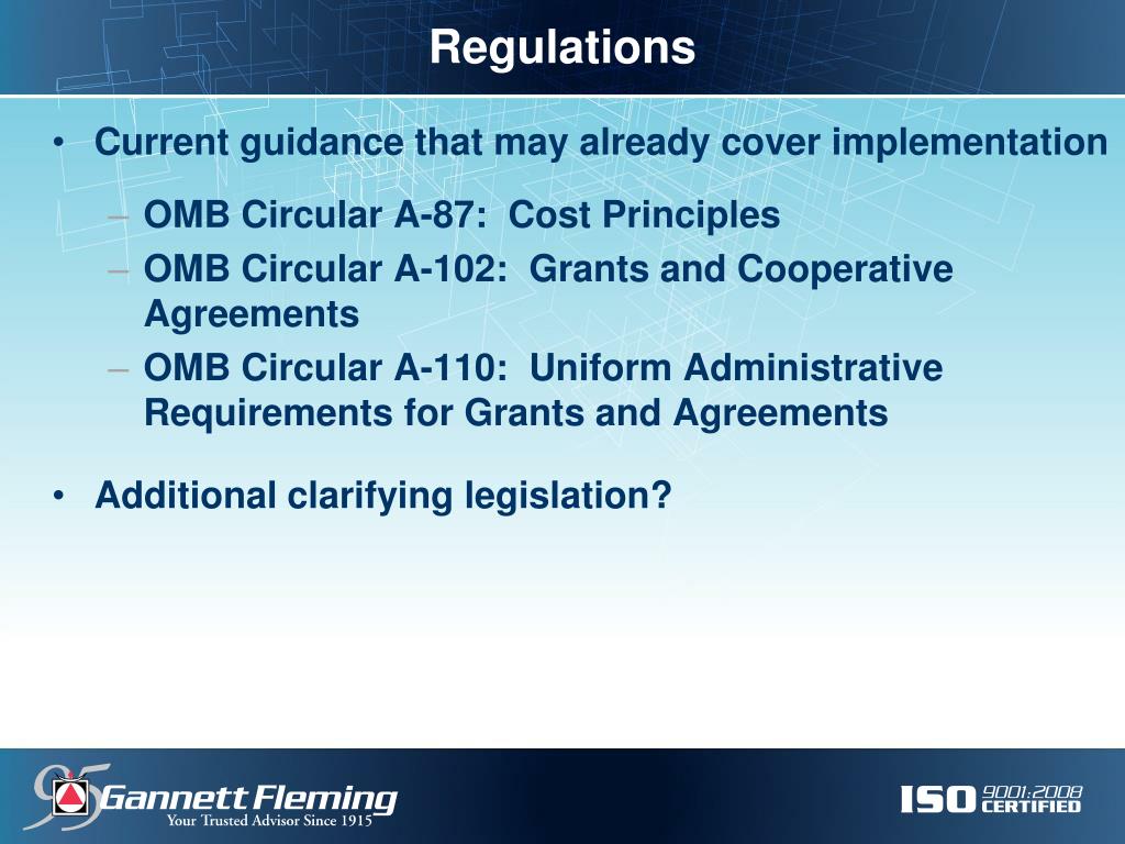 Regulations • Current guidance that may already cover implementation • OMB Circular A-87: Cost Principles • OMB Circular A-102: Grants and Cooperative Agreements • OMB Circular A-110: Uniform Administrative Requirements for Grants and Agreements • Additional clarifying legislation?