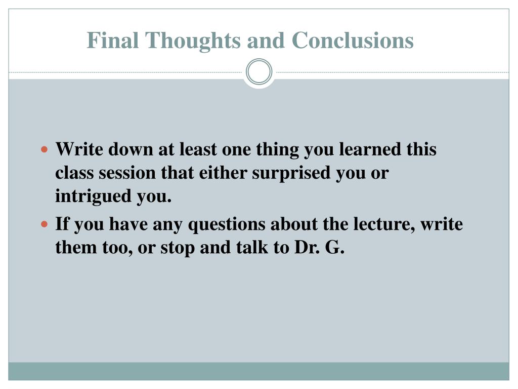 Final Thoughts and Conclusions • Write down at least one thing you learned this class session that either surprised you or intrigued you. • If you have any questions about the lecture, write them too, or stop and talk to Dr. G.