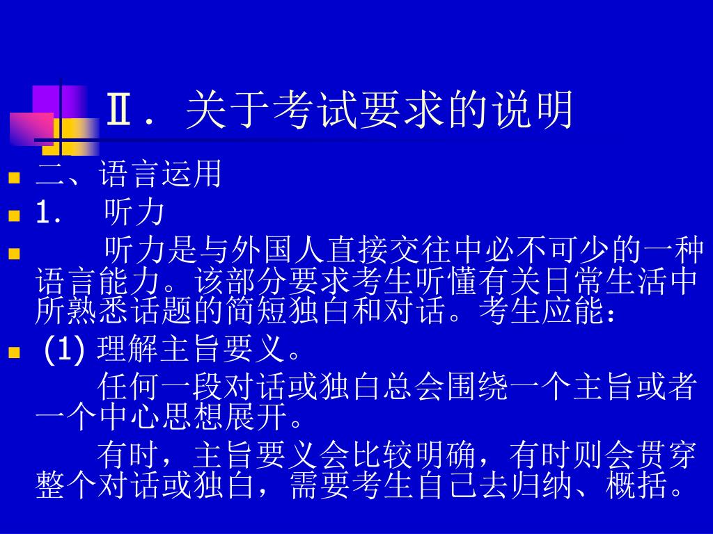Ⅱ.关于考试要求的说明 • 二、语言运用 • 1. 听力 • 听力是与外国人直接交往中必不可少的一种语言能力。该部分要求考生听懂有关日常生活中所熟悉话题的简短独白和对话。考生应能: • (1) 理解主旨要义。 任何一段对话或独白总会围绕一个主旨或者一个中心思想展开。 有时,主旨要义会比较明确,有时则会贯穿整个对话或独白,需要考生自己去归纳、概括。