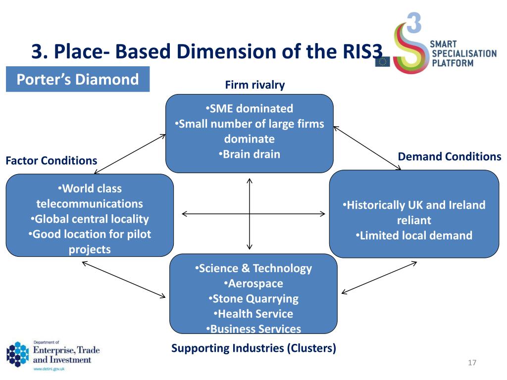 3. Place- Based Dimension of the RIS3 Porter’s Diamond Firm rivalry • SME dominated • Small number of large firms dominate • Brain drain Demand Conditions Factor Conditions • Historically UK and Ireland reliant • Limited local demand • World class telecommunications • Global central locality • Good location for pilot projects • Science & Technology • Aerospace • Stone Quarrying • Health Service • Business Services Supporting Industries (Clusters)