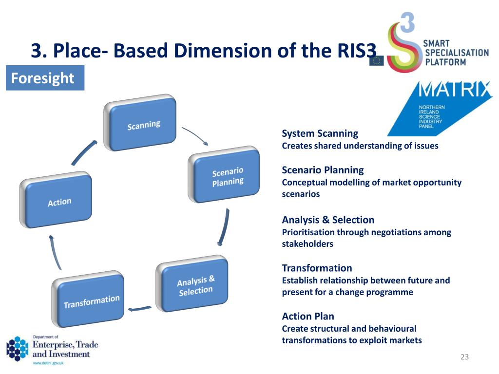3. Place- Based Dimension of the RIS3 Foresight • System Scanning • Creates shared understanding of issues • Scenario Planning • Conceptual modelling of market opportunity scenarios • Analysis & Selection • Prioritisation through negotiations among stakeholders • Transformation • Establish relationship between future and present for a change programme • Action Plan • Create structural and behavioural transformations to exploit markets