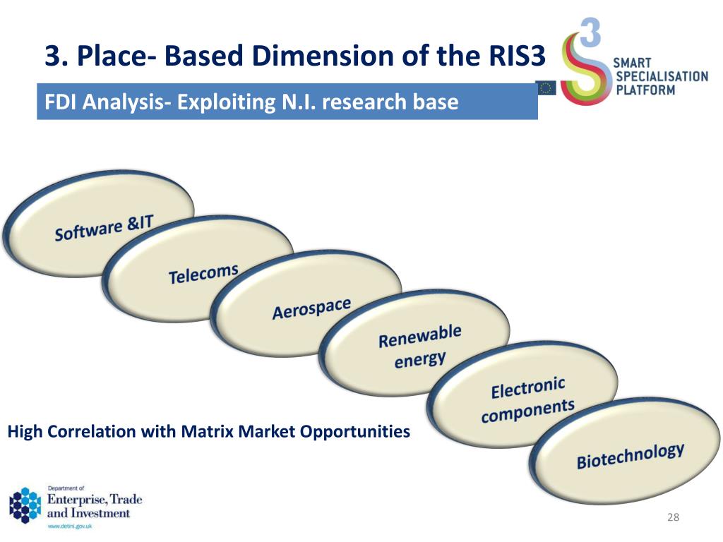 3. Place- Based Dimension of the RIS3 FDI Analysis- Exploiting N.I. research base Software &IT Telecoms Aerospace Renewable energy Electronic components High Correlation with Matrix Market Opportunities Biotechnology