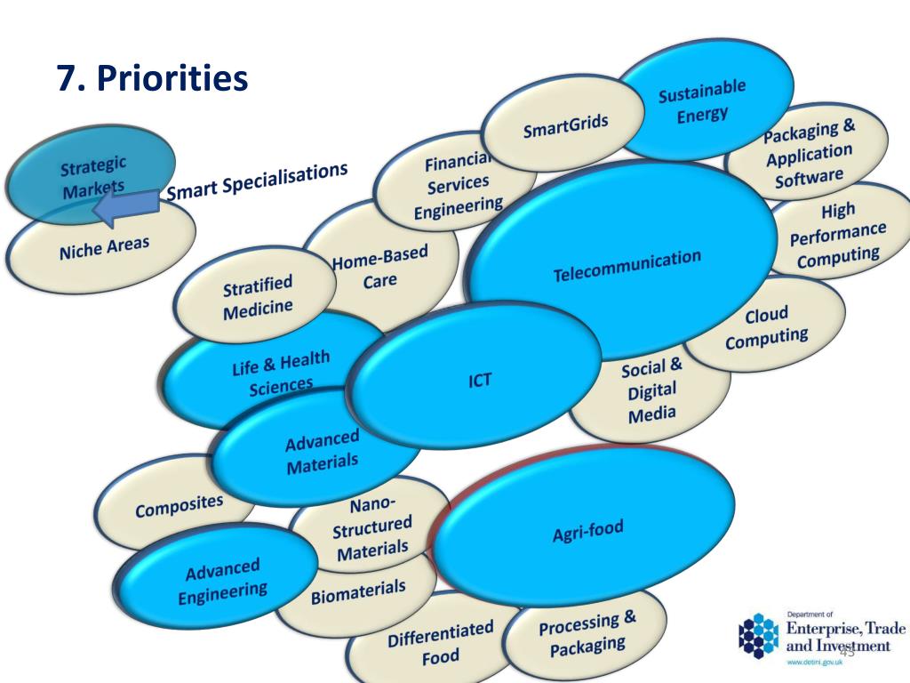 7. Priorities Sustainable Energy SmartGrids Packaging & Application Software Strategic Markets Financial Services Engineering Smart Specialisations Telecommunication High Performance Computing Niche Areas Home-Based Care Stratified Medicine Cloud Computing ICT Life & Health Sciences Social & Digital Media Advanced Materials Agri-food Composites Nano-Structured Materials Advanced Engineering Biomaterials Processing & Packaging Differentiated Food