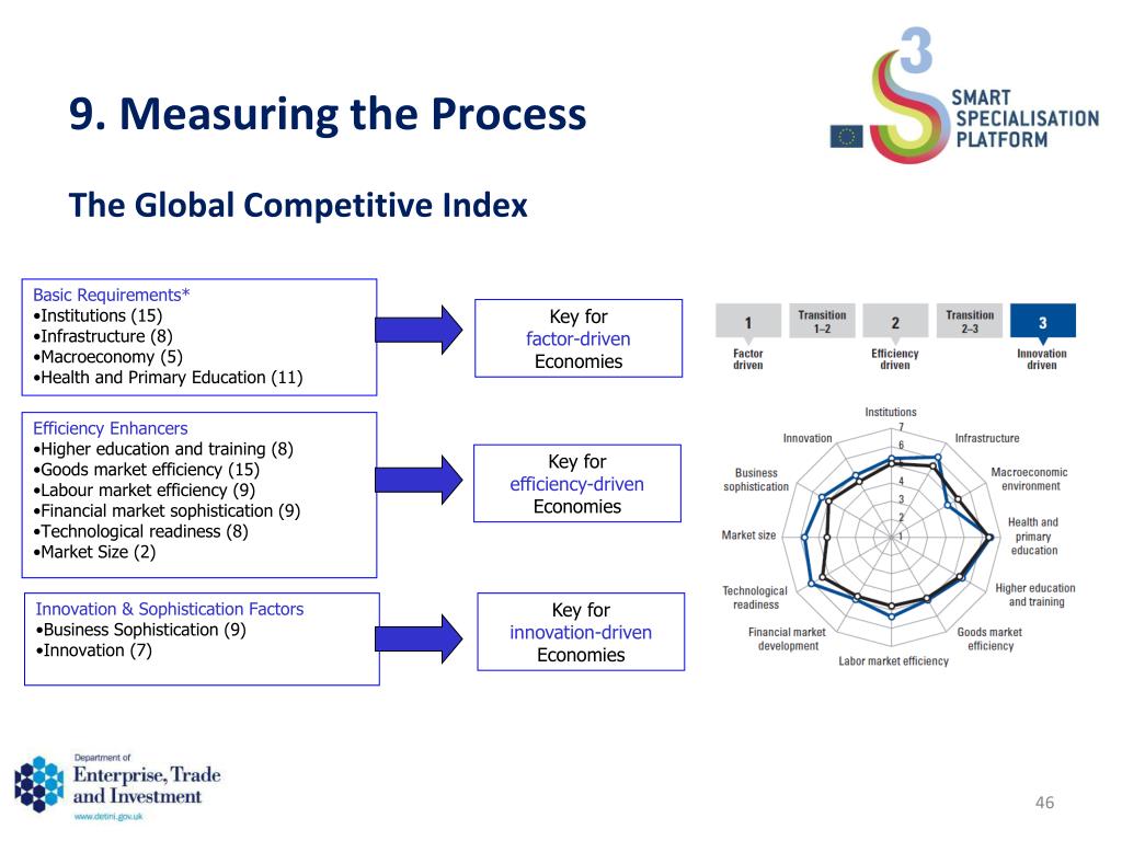 Basic Requirements* • Institutions (15) • Infrastructure (8) • Macroeconomy (5) • Health and Primary Education (11) Key for factor-driven Economies • Efficiency Enhancers • Higher education and training (8) • Goods market efficiency (15) • Labour market efficiency (9) • Financial market sophistication (9) • Technological readiness (8) • Market Size (2) Key for efficiency-driven Economies • Innovation & Sophistication Factors • Business Sophistication (9) • Innovation (7) Key for innovation-driven Economies 9. Measuring the Process The Global Competitive Index