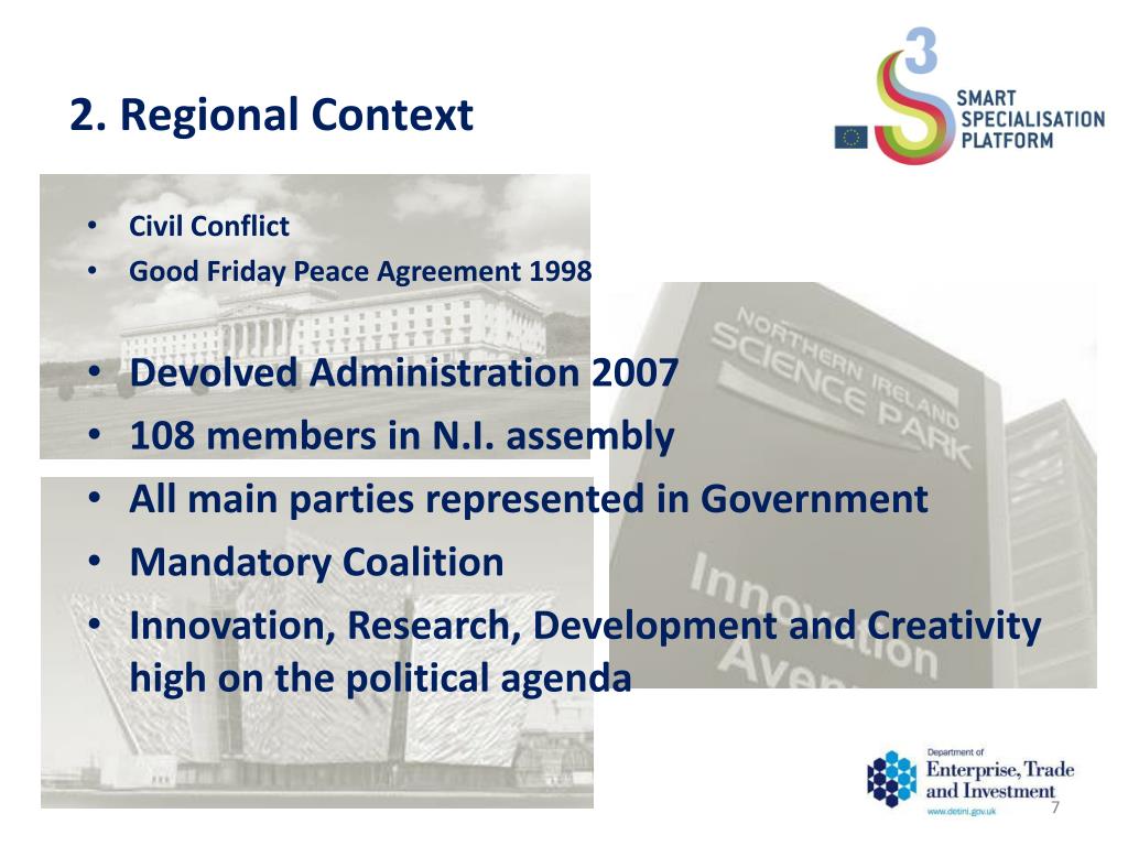 2. Regional Context • Civil Conflict • Good Friday Peace Agreement 1998 • Devolved Administration 2007 • 108 members in N.I. assembly • All main parties represented in Government • Mandatory Coalition • Innovation, Research, Development and Creativity high on the political agenda