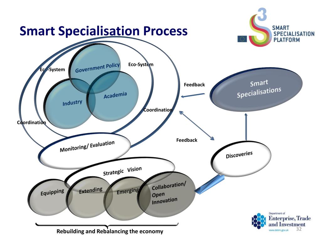 Smart Specialisation Process Government Policy Eco-System Eco-System Smart Specialisations Academia Industry Feedback Coordination Coordination Monitoring/ Evaluation Feedback Discoveries Strategic Vision Collaboration/ Open Innovation Extending Emerging Equipping Rebuilding and Rebalancing the economy