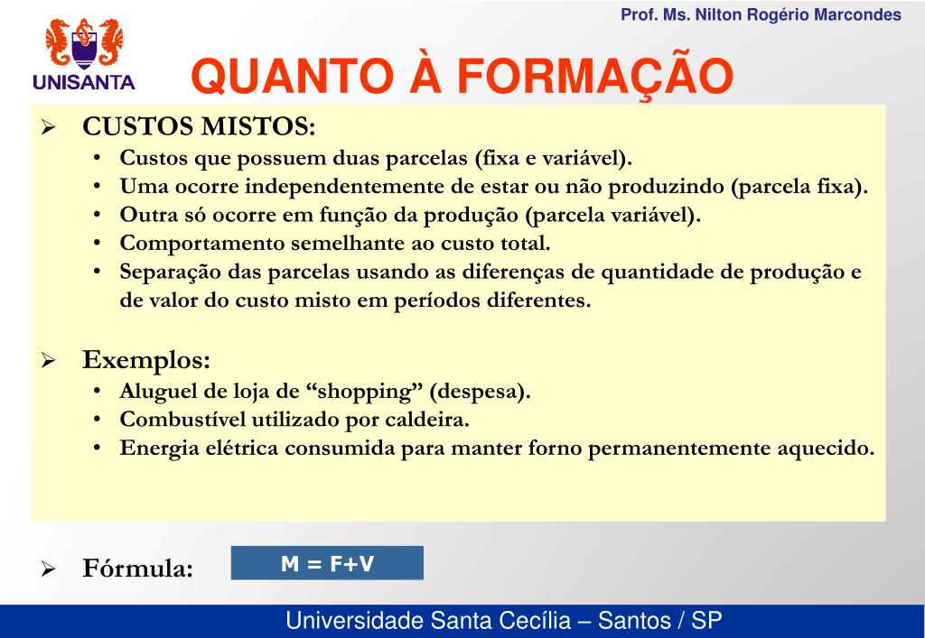 QUANTO À FORMAÇÃO • CUSTOS MISTOS: • Custos que possuem duas parcelas (fixa e variável). • Uma ocorre independentemente de estar ou não produzindo (parcela fixa). • Outra só ocorre em função da produção (parcela variável). • Comportamento semelhante ao custo total. • Separação das parcelas usando as diferenças de quantidade de produção e de valor do custo misto em períodos diferentes. • Exemplos: • Aluguel de loja de “shopping” (despesa). • Combustível utilizado por caldeira. • Energia elétrica consumida para manter forno permanentemente aquecido. M = F+V • Fórmula: