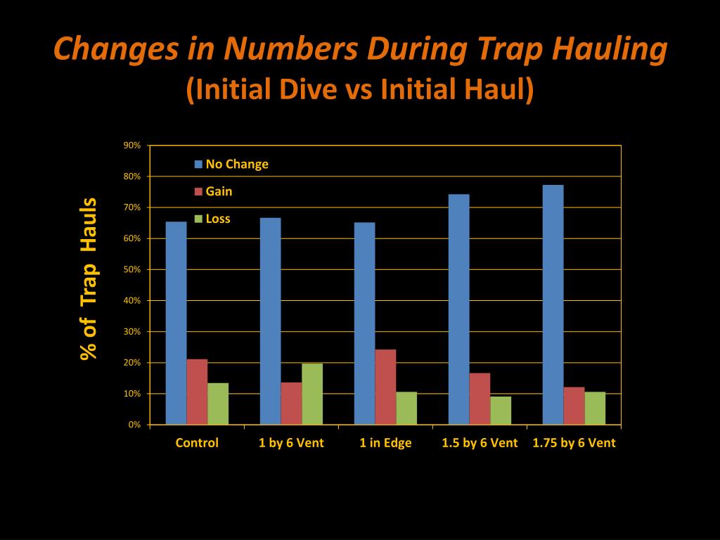 Field Testing Series • Phase 1 field testing with vents from diving studies. • Phase 2 Field testing. 1 by 53/4, 1 3/8 by 53/4, 1 3/8 by 93/4, 11/2 by 53/4 and control traps. • Phase 3 testing. 1 by 53/4, 1 3/8 by 53/4, 1 1/4 by 53/4 (top of trap), 1 1/4by 53/4 (bottom of trap) and control traps. • Phase 4 testing. 1 3/8 by 53/4 placed on the front and back top and bottom to test for vent location.