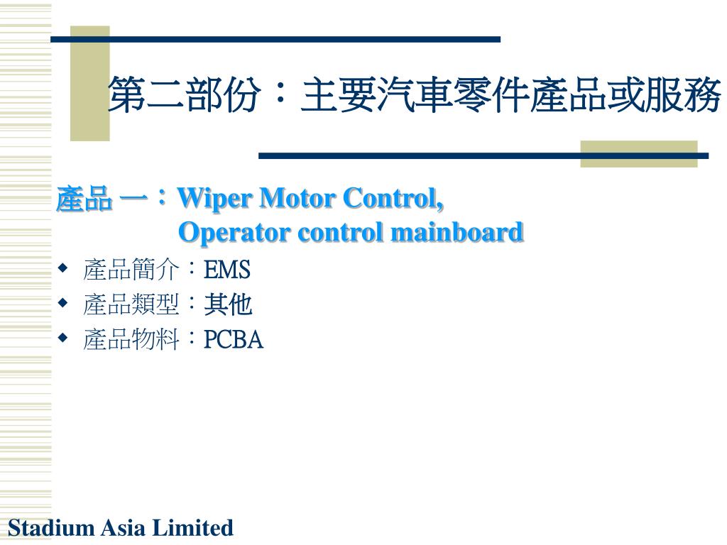 第二部份︰主要汽車零件產品或服務 產品 一:Wiper Motor Control, Operator control mainboard • 產品簡介︰EMS • 產品類型︰其他 • 產品物料︰PCBA Stadium Asia Limited